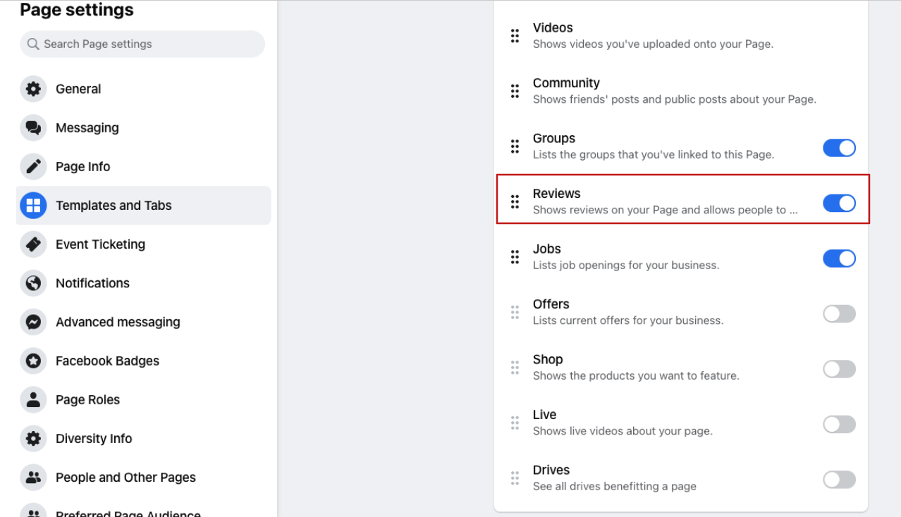 3. Turn on the “Reviews” module. This will allow visitors to leave reviews on your page and build up your business’s credibility. To do this, go to “Settings” > “Templates and Tabs” and make sure the “Reviews” section is toggled on.
